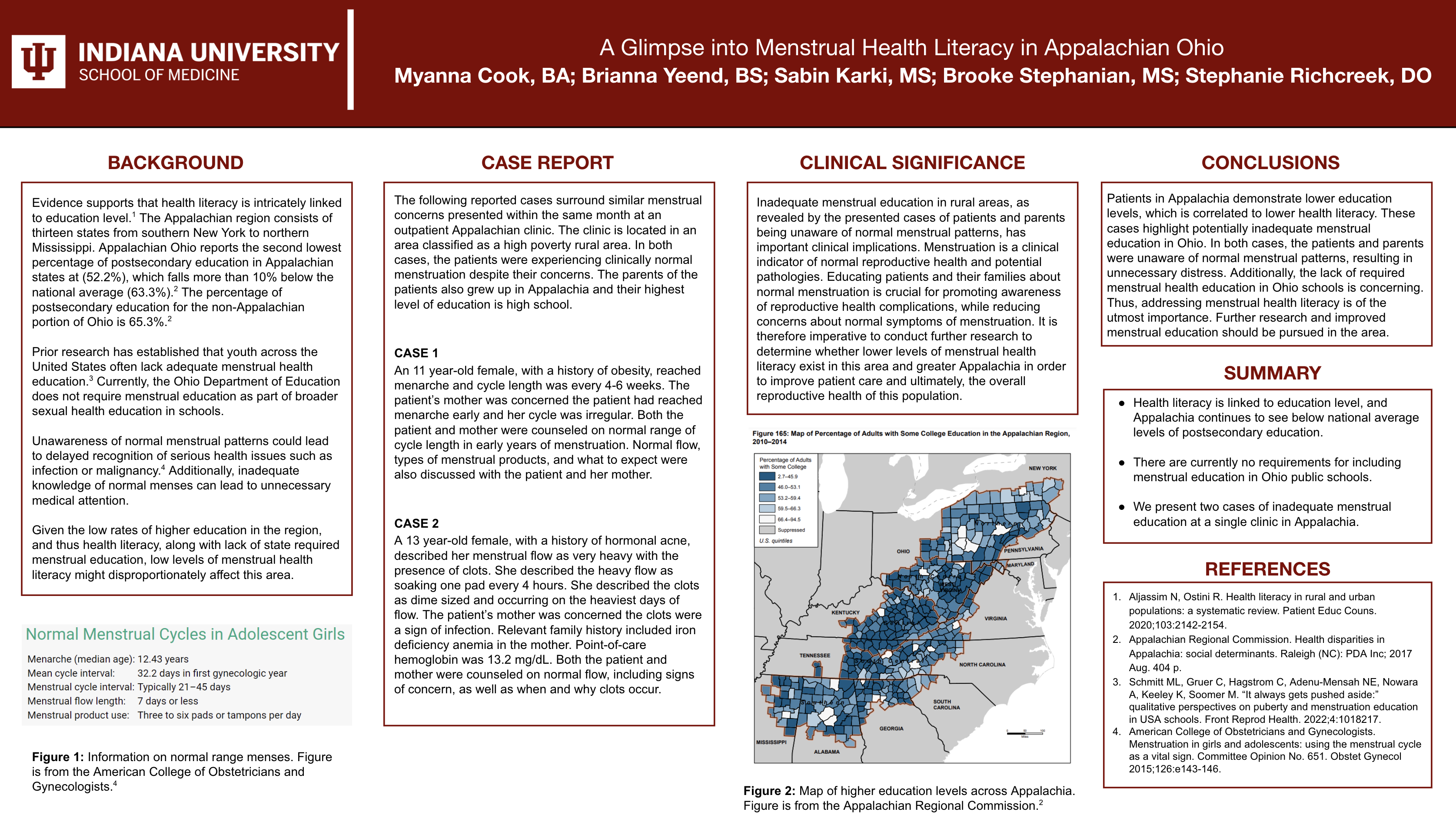 • Cook, M., Yeend, B., Karki, S., Stephanian, B.A., Richcreek, S. A Glimpse into Menstrual Health Literacy in Appalachian Ohio. American Medical Women’s Association Annual Meeting. Philadelphia, PA. Apr., 2023.