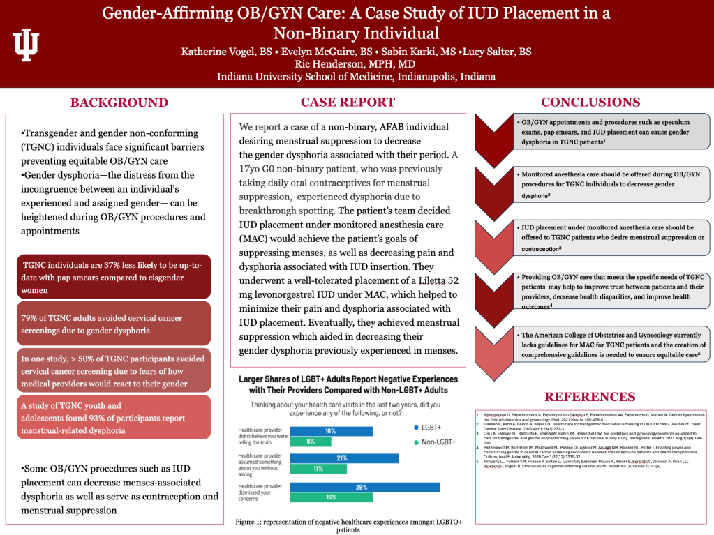 • Vogel K., McGuire E., Karki S., Salter L., Henderson R. BS. Gender-Affirming OB/GYN Care: A Case Study of IUD Placement in a Non-Binary Individual. American Medical Women’s Association Annual Meeting. Philadelphia, PA. Mar., 2024.