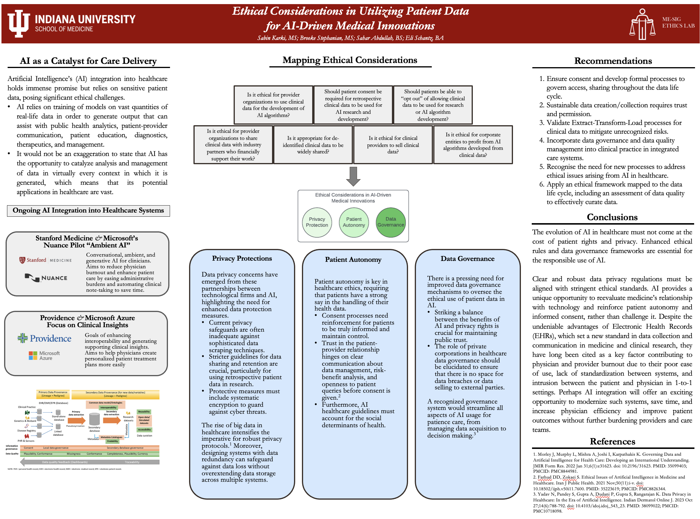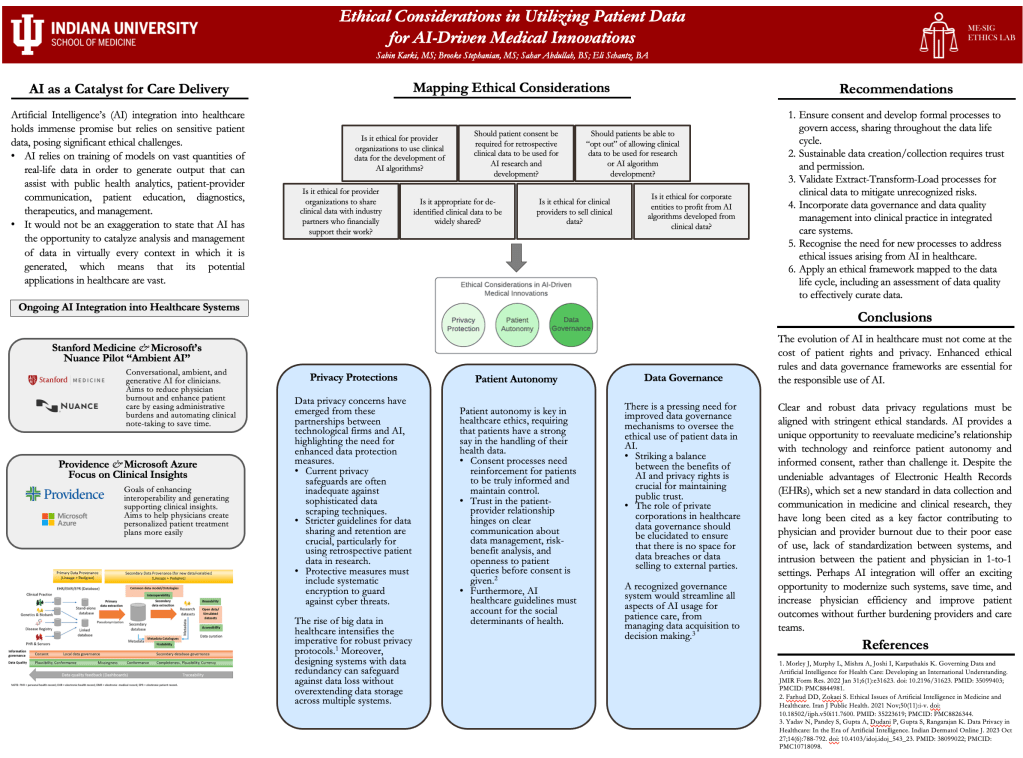 • Karki S., Stephanian B. A., Abdullah S., Schantz E. Ethical Considerations in Utilizing Patient Data for AI-Driven Medical Innovations. Annual Midwest Medical Humanities Conference. Indianapolis, IN. Mar., 2024.
