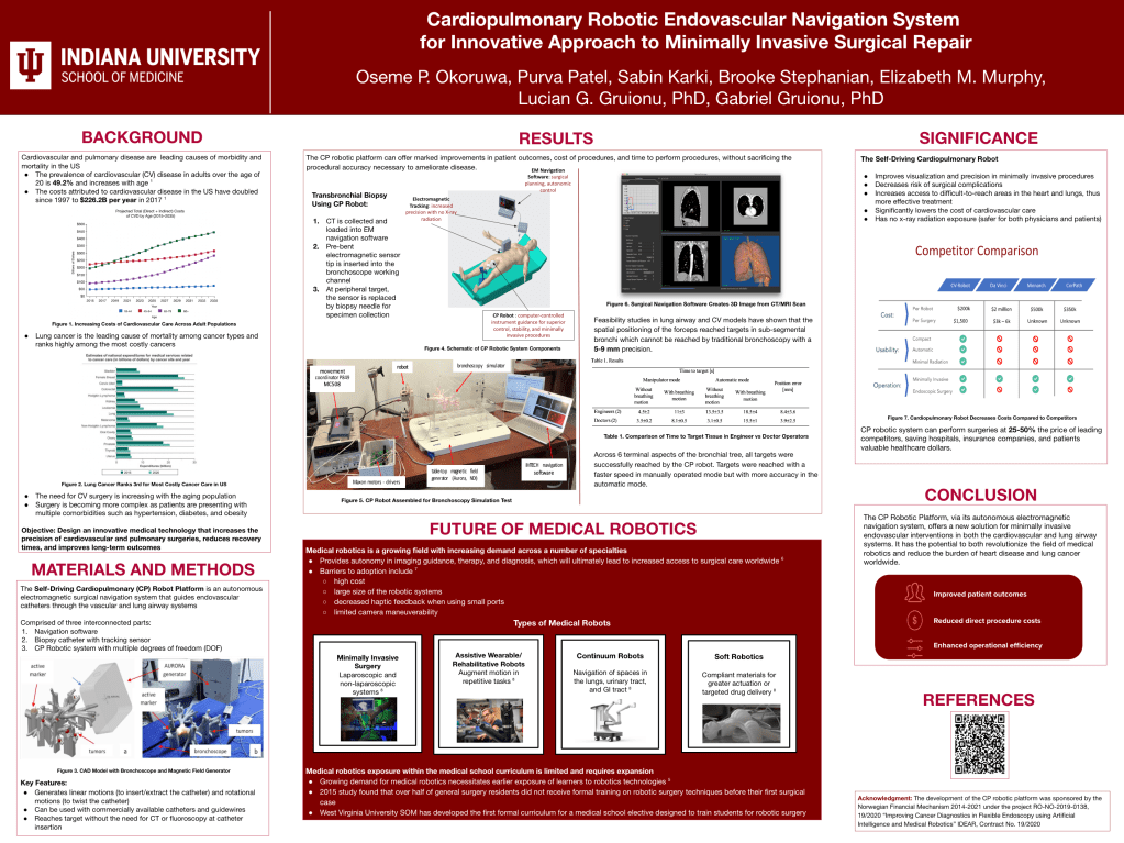 • Okoruwa, P.O., Patel, P., Karki, S., Stephanian, B.A., Murphy, E.M., Gruionu, L.G., Gruionu, G. Cardiopulmonary Robotic Endovascular Navigation System for Innovative Approach to Cardiovascular and Pulmonary Minimally Invasive Surgical Repair. American Medical Women’s Association Annual Meeting. Philadelphia, PA. Apr., 2023.