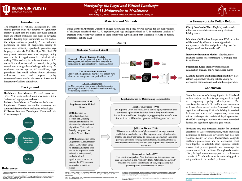 • Karki S., Stephanian B. A., Abdullah S., Schantz E. Navigating the Legal and Ethical Landscape of AI Malpractice in Healthcare. Annual Midwest Medical Humanities Conference. Indianapolis, IN. Mar., 2024.